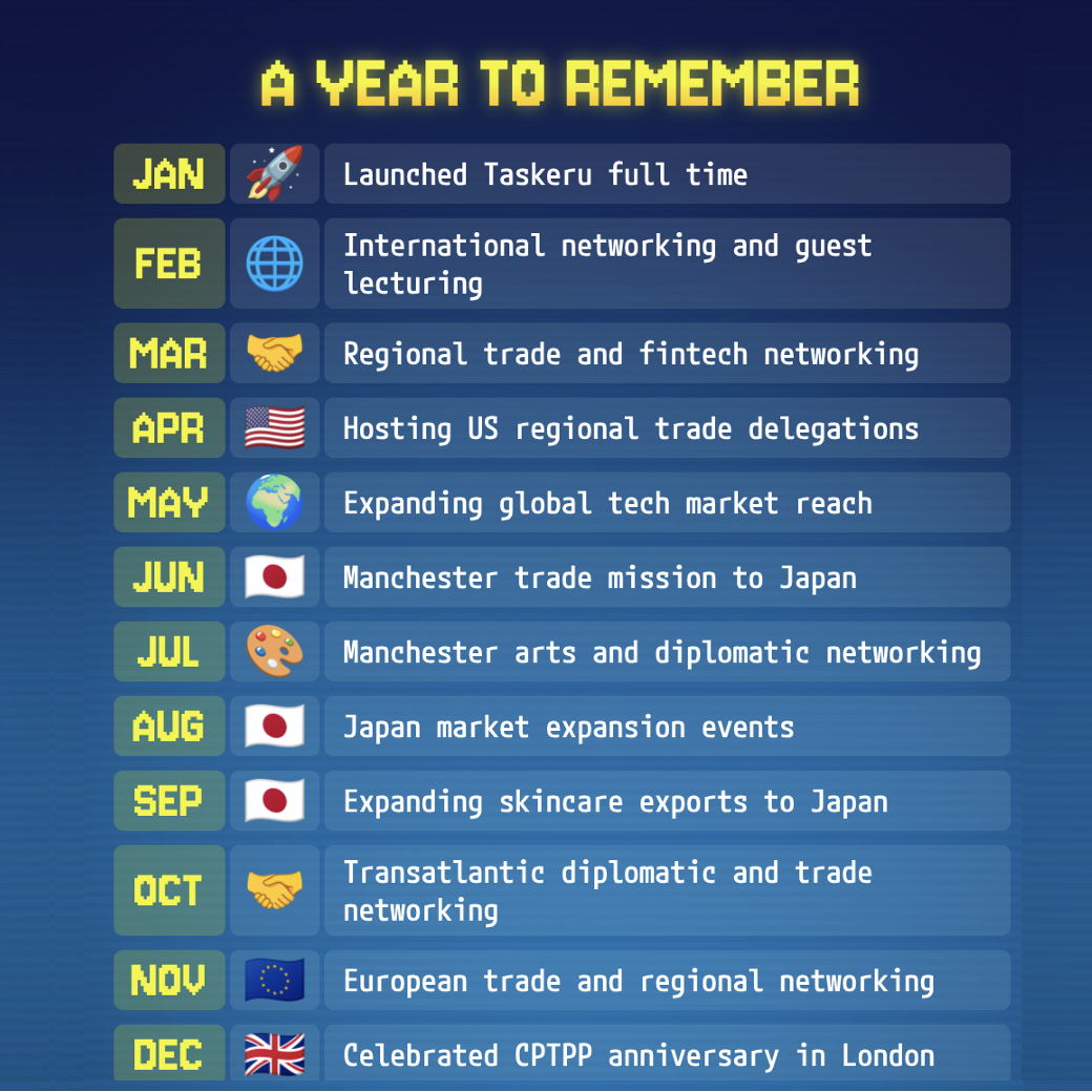 Towards the end of the year, I was delighted to meet with the Japanese Ambassador and the Mayor of the City of London at the beautiful Foreign and Commonweath offices to celebrate a year of the Accession of the UK to the CPTPP Free Trade Agreement. This is providing significant opportunities for UK companies particularly those in manufacturing looking to many of the ASEAN nations who are also members.